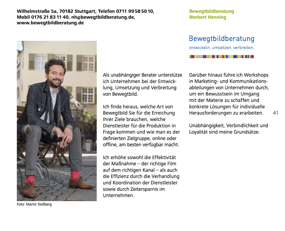Man muss ja auch mal sagen, was man kann! Im aktuellen Verzeichnis der Kreativdienstleister der Region Stuttgart, herausgegeben von der Wirtschaftsförderung Region Stuttgart GmbH, hab ich mir deswegen mal eine Seite gegönnt. Das ganze Verzeichnis gibt's hier als .pdf oder hier zu bestellen, ist ja keine Konkurrenz drin, macht schliesslich keiner was ich mach.