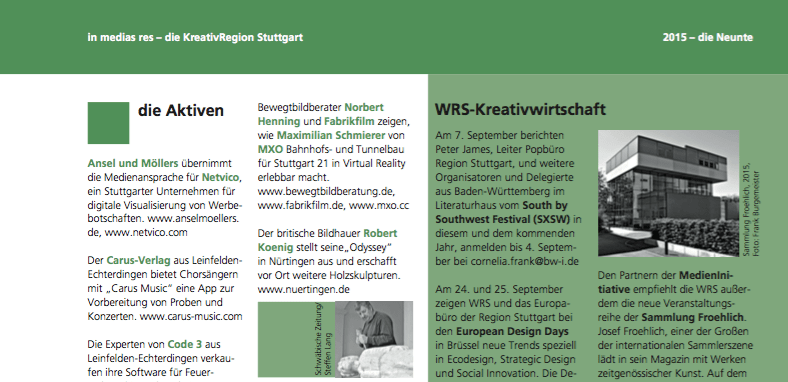 Der Newsletter der KreativRegion Stuttgart. Die URL hat zwar eine falsche Trennung und im .pdf war sie falsch verlinkt, aber hey: Meldung ist Meldung, und ausserdem meine erste eigene! Das Original gibt's hier http://www.kreativ.region-stuttgart.de/services/publikationen/newsletter-in-medias-res/