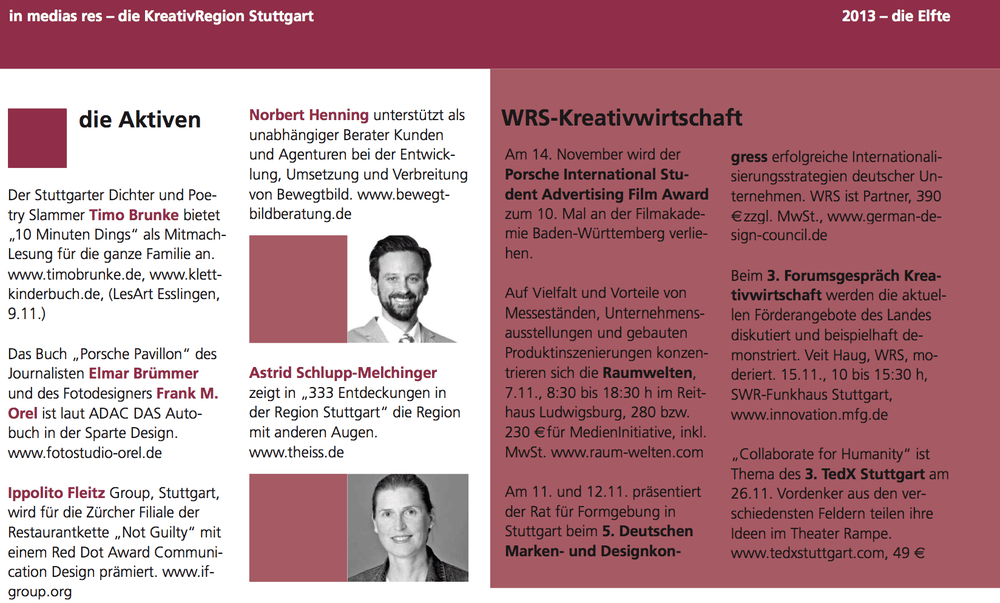 Man muss ja auch mal sagen, was man kann! Im aktuellen Verzeichnis der Kreativdienstleister der Region Stuttgart, herausgegeben von der Wirtschaftsförderung Region Stuttgart GmbH, hab ich mir deswegen mal eine Seite gegönnt. Das ganze Verzeichnis gibt's hier als .pdf oder hier zu bestellen, ist ja keine Konkurrenz drin, macht schliesslich keiner was ich mach.